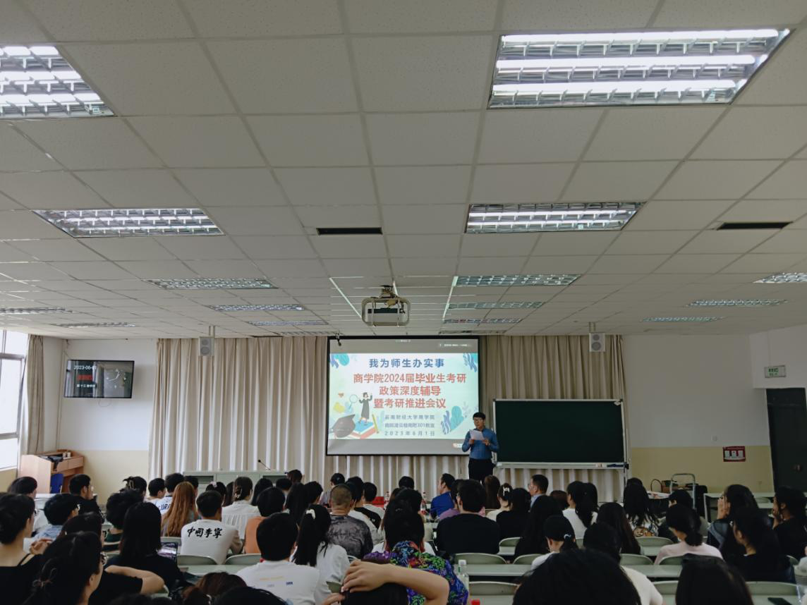 商学院部分科室负责人、2024届毕业班辅导员班主任、有考研意向的2020级本科生参加线下会议,部分有考研意向的2021级学生通过线上参会。