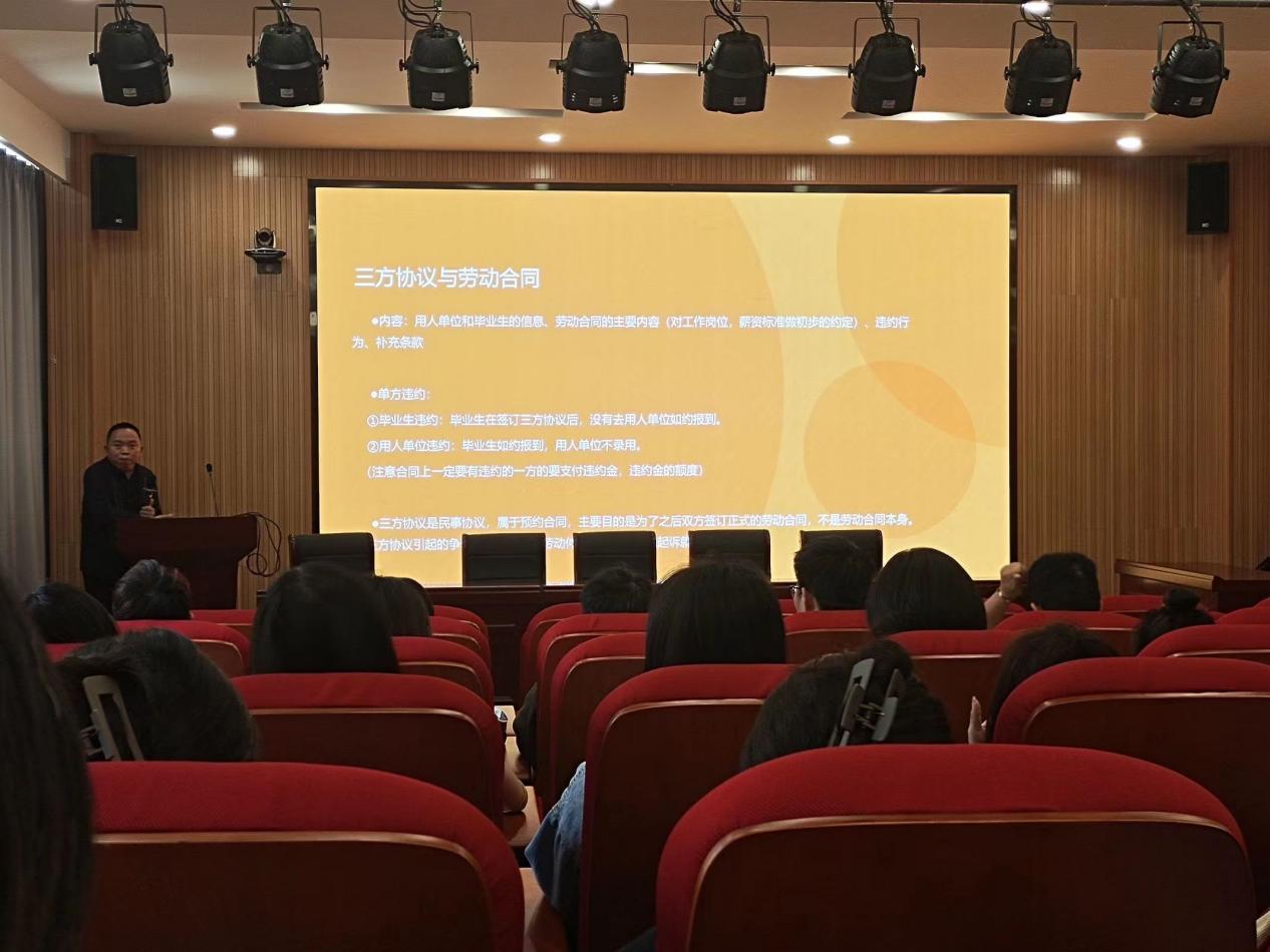 陈先波详细介绍了大学生就业权益维护的相关知识、劳动者的权利与义务以及劳动合同签订的注意事项等。宣讲会结合毕业生就业入职实际需要,通过相关案例的阐述,在宣讲会后进行了互动答疑环节,同学们踊跃提出相关权益维护问题。通过就业权益维护宣讲活动,同学们深刻认识到就业权益维护相关知识,提高了劳动权益维护意识。