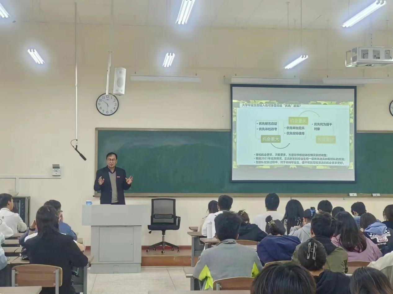 李永祥介绍了国防动员的含义、大学生应征入伍相关政策与激励措施,并就大学生应征报名程序、征兵体检以及如何做好应征准备等方面内容作了指导。谷彦霆分别介绍了基层就业及志愿服务项目、自主创业、劳动合同和社会保险等相关知识,引导毕业生把握好国家政策,在相关政策和激励措施的帮助下实现大学生更好就业创业,成就自身职业发展愿景。