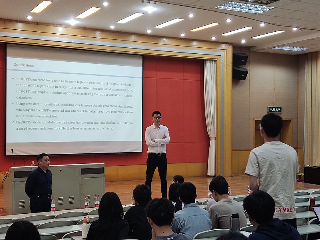董轶哲做主题为《Unleashing the power of text for credit default prediction: Comparing human-generated and AI-generated texts via a deep learning approach》的讲座。董轶哲介绍了一项国际前沿性主题研究,通过深度学习方法比较分析了人工生成文本和AI生成文本,旨在释放文本信息在信贷违约预测中的力量。董轶哲首先介绍了最近火爆全网的ChatGPT,通过生动有趣的例子让同学们理解了ChatGPT回答的逻辑性以及与搜索引擎相比的特殊性,并且还强调可以运用ChatGPT来辅助我们快速得到更好的方案,提高工作效率等。董轶哲对该项研究的目的、内容、思路和结论等方面进行详细阐述,“ChatGPT生成的文本可以比使用人工生成的文本产生更好的预测结果”的研究成果,可以为未来收集贷款评估信息提供一系列建议。在讲座尾声阶段,董轶哲对学生和老师提出的相关问题进行耐心细致的解答。