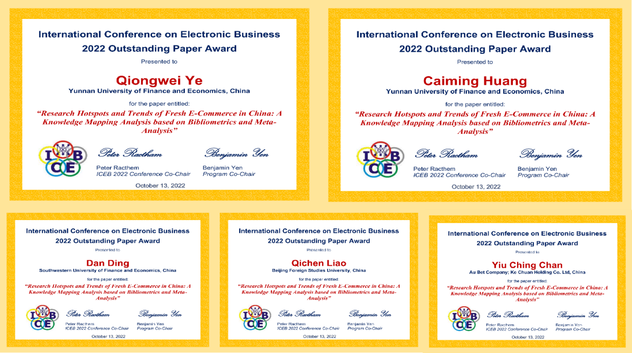 10月13至17日,第22届国际电子商务学术会议在泰国曼谷举行,主题为“疫情后电子商务的新挑战与机遇”。本次会议在102篇论文中,共产生了7篇最佳,其中叶琼伟教授团队发表的论文《Research Hotspots and Trends of Fresh ECommerce in China: A Knowledge Mapping Analysis based on Bibliometrics and Meta-Analysis》经过多位专家评选,获评最佳论文奖。最佳论文作者来自全球十余个高校与国家实验室等研究机构,beat365英国官方网站是中国大陆唯一获评单位。