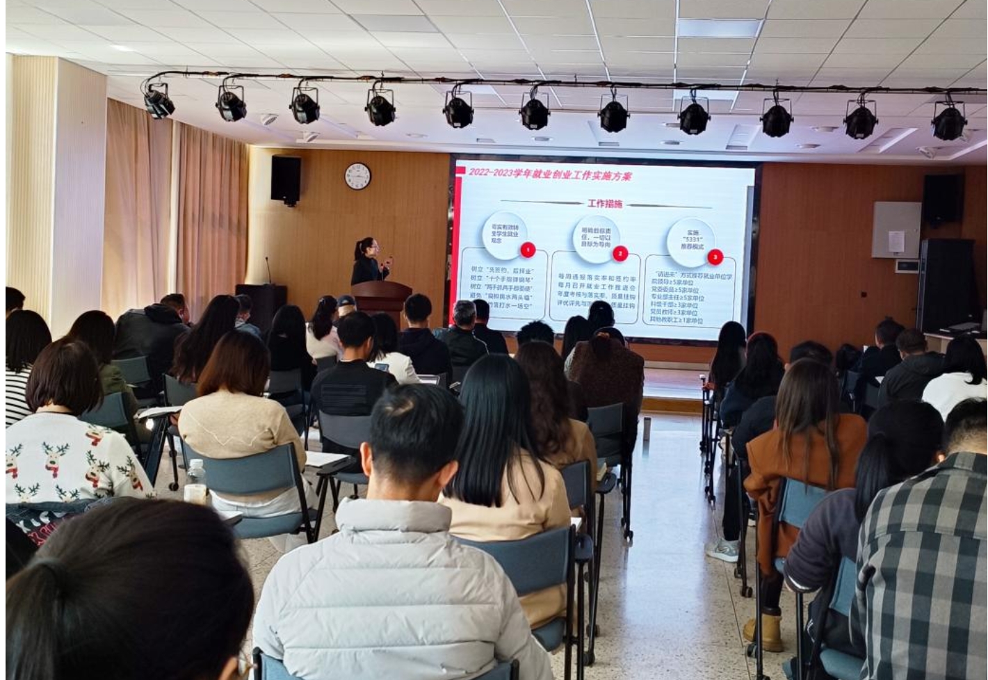 张玉琨通报了学院2022届毕业生就业情况,介绍了2023届毕业生基本情况及签约情况,详细讲解了《中华职业学院2022-2023学年就业工作实施方案》的17条具体工作措施,并提出四点工作要求:一是提高政治站位,强化责任意识;二是加强协同联动,形成工作合力;三是强化责任追究,规范就业统计;四是强化队伍建设,提升工作实效。同时,在开展就业工过程中要严格执行教育部就业工作“三严禁”“四不准”“三不得”要求。“就业是民生之本、发展之基,希望全院教职工携手努力,共同建设好就业这个最大的民生工程。”