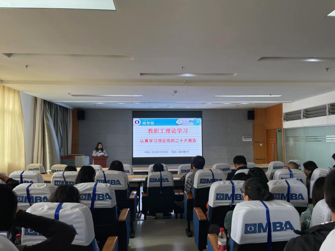 为指导全体教职工全面准确学习领会党的二十大精神,10月28日下午,商学院在南院逸夫楼410报告厅组织开展本月的理教职工论学习。学院党委书记王敏和院长杨增雄主讲,办公室主任江东书主持,全体教职工参会。