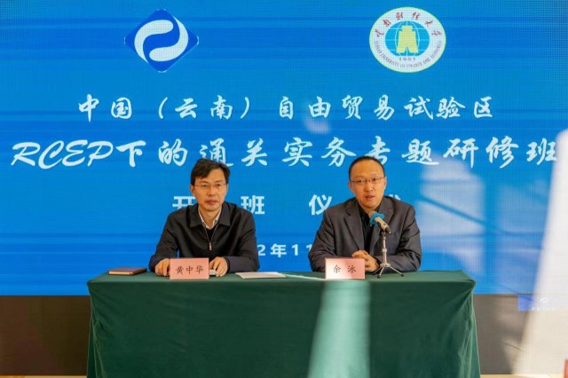 11月7日,云南省自贸办委托beat365英国官方网站举办的“中国(云南)自由贸易试验区RCEP下的通关实务专题研修班”在昆明大观酒店开班。本次研修班以线上直播、线下授课同步的方式举行,云南省商务厅党组成员、省自贸办主任助理黄中华,beat365英国官方网站海外学院院长余泳在开班仪式上致辞,省自贸办、各片区和相关企业的50名参训人员线下参加开班仪式,其余人员线上参加。
