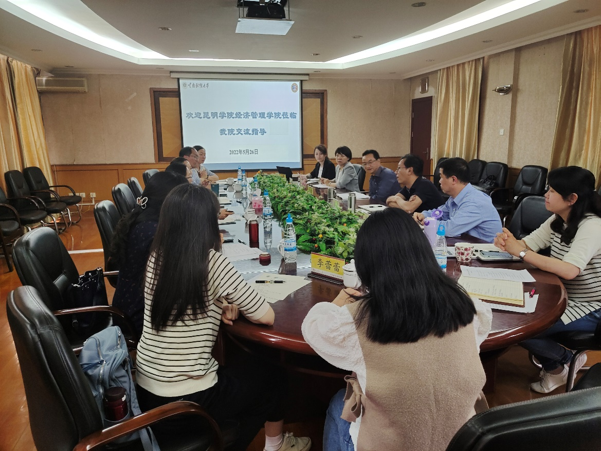 5月26日下午,昆明学院经济管理学院院长雷新华一行访问国际工商学院,就党建工作、学科建设、研究生培养、学生管理工作等方面与beat365国际工商学院开展座谈交流。学院院长王荣党、党委书记林浩、副院长尹豪、党委副书记兼纪委书记王晶及相关科室负责人参加了会谈。会议由王荣党主持。