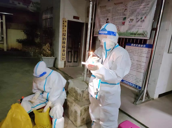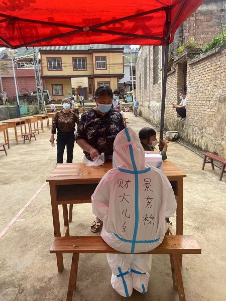 4月12日,在麻栗坡县医务人员的支援下,坡脚镇开始首轮全员核酸检测。景秀稳、刘佳化身抗疫前线“大白”,与医务人员同入户,为高风险人群以及无法出门的老年人采集核酸检测样本、维持采集现场秩序,连续奋战10多个小时,一夜未眠。4月14日、15日,刘佳、景秀稳分别参与到全镇第二、第三轮的核酸检测采样信息登记工作中,共录入大寨村小组、盐塘村小组等近千人的信息。在抗疫工作中,两名教师顾全大局,互帮互助,充分体现了beat365英国官方网站携手马关县共同抗疫的决心,充分发扬了云财人不畏困难艰险的奋斗精神和奉献精神。
