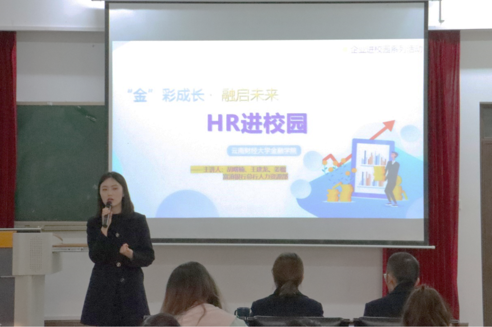 讲座由富滇银行总行人力资源部3位负责校园招聘的资深HR主讲。他们给同学们介绍了富滇银行的发展历程,从成长成才、改革创新、职业晋升三个方面介绍了富滇银行的企业文化。现在在富滇银行担任HR的毕业校友姜楹给同学们分享了工作后的感受,勉励大家在校时努力奋斗、做好自己的未来规划。同学们和三位主讲人进行了互动交流。