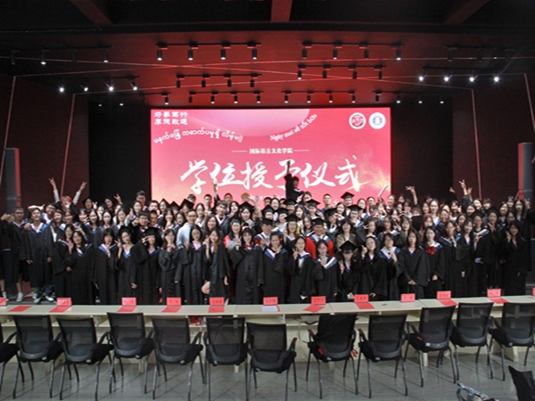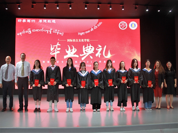 教师代表沈清清发言,她以中、英、泰三种语言寄语即将踏上人生新征程的毕业生,不惧困难,未来可期。毕业生家长代表通过视频的方式,向学院和毕业生报以祝贺。毕业生代表梁馨心、李瑞雪分别用中、泰,中、英语言发言,回顾四年的青春时光,展望毕业后的美好未来,号召广大毕业生们勇担使命,不负韶华。刘代容代表学院致辞,用中、英、日三种语言向毕业生们送上了最真挚的祝福和期望。