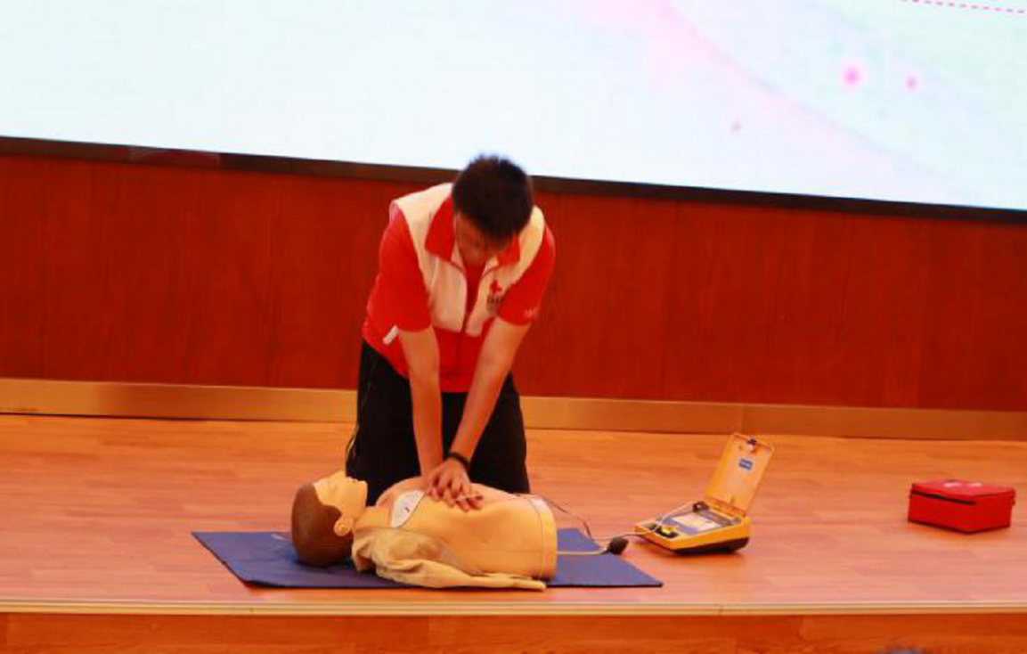 培训讲座为同学们介绍了红十字会的起源与历史、休克现场的应急救护等知识,并重点讲解了心肺复苏、自动体外除颤器(AED)的使用以及海姆立克急救法的详细步骤。通过理论和实际操作相结合,两位讲师运用AED教学机、人体模型等道具,逐一讲解了止血、包扎、骨折固定、关节脱位与扭伤救护方法、心肺复苏等急救理论与施救技巧,普及了日常急救知识。