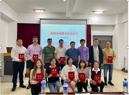 熊德平对通过遴选获得指导资格的教师表示祝贺,并依次为新聘校外导师庄懿、和恩义以及新聘院内导师王婉青、王瑶颁发聘书,为近3年获聘的杨荣海、周娅娜、薛霖、赖付军、姚休义等5位导师补发聘书。