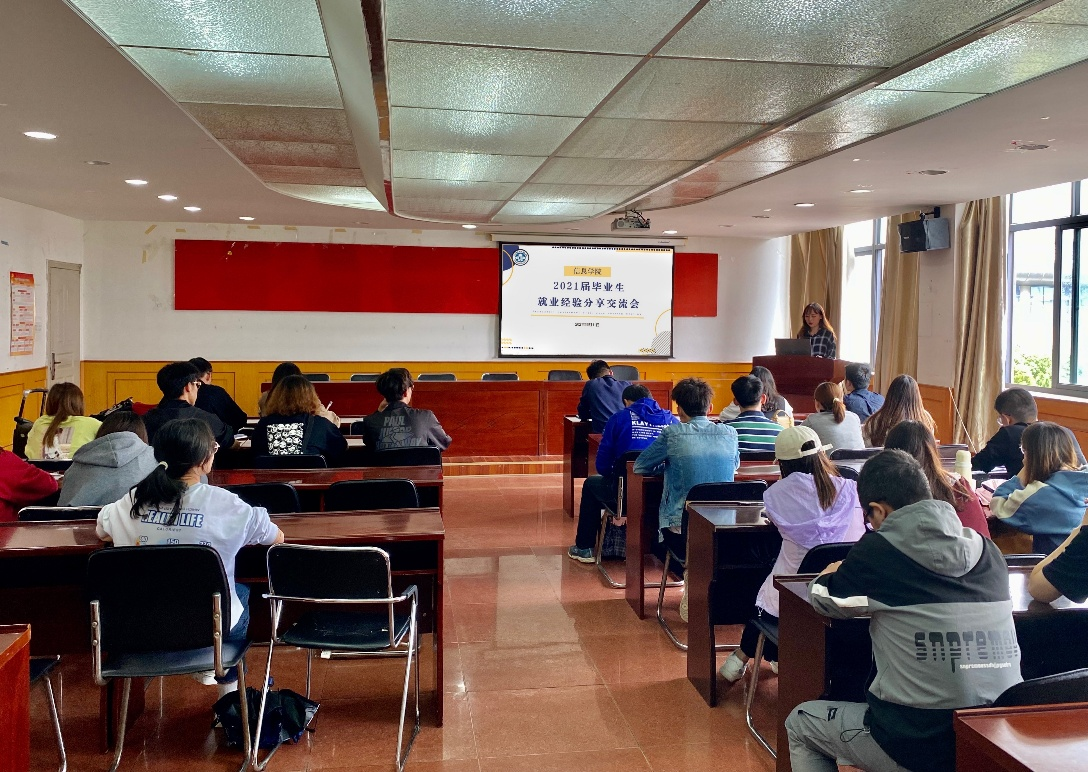 在实习实践经验分享环节,毕业生陈超前结合自身求职经历,提醒同学们要重视实习经历,明确就业目标。一方面要多留意大城市和高知名度企业的实习机会,另一方面也要积极参加校招,广泛投递简历,为自己创造机会,减轻就业压力。秦治翔分享了个人在自媒体择业方面的经验。