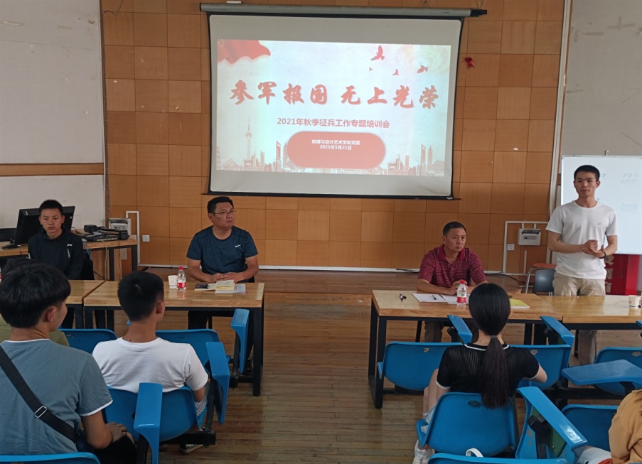 5月21日下午14:30,传媒与设计艺术学院在学院314开展征兵工作政策宣讲会,邀请学校武装部国防科主任冯勇、信息学院、旅游与酒店管理学院两名退伍复学同学做宣讲,宣讲会由党委副书记杨青山主持,学生管理科骆江霞、有意愿入伍学生、学院退伍复学学生、各班班长团支书共50余人参加。