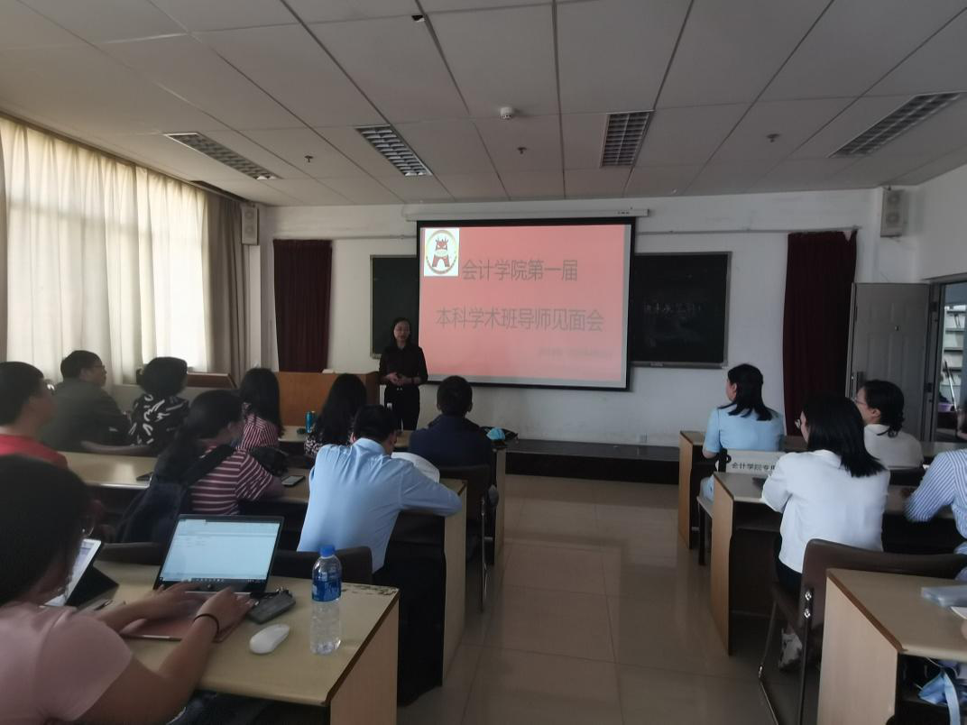 为推进学院“三全育人”综合改革试点建设工作,进一步发挥好科研育人作用,培养学生本科期间的学术素养和科研能力。会计学院于2020年选拔2018、2019级50名优秀的本科生组成第一届本科学术班,并组织多次本科学术训练辅导。4月16日,学院在逸夫楼717教室举办了第一届本科学术班导师见面会。会议由会计学院林雁副教授主持,学院青年学术骨干教师、在读博士生和第一届本科学术班全体同学参加会议。