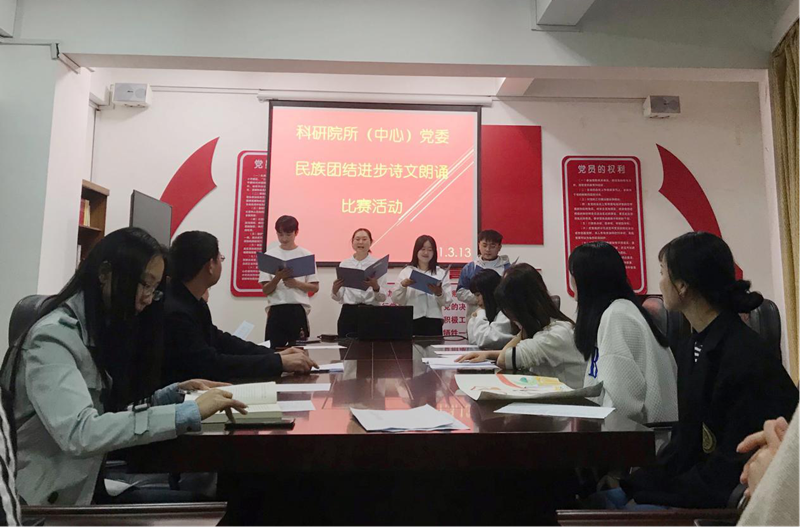 3月13日,直属团支部和研究生会联合举办了民族团结进步诗文朗诵比赛活动,活动以歌颂祖国、民族团结为主题。科研院所(中心)党委的同学们踊跃参加活动,诗文朗诵声情并茂、激情洋溢。活动现场还展示了科研院所(中心)党委本次参赛的两幅民族团结进步的绘画作品。