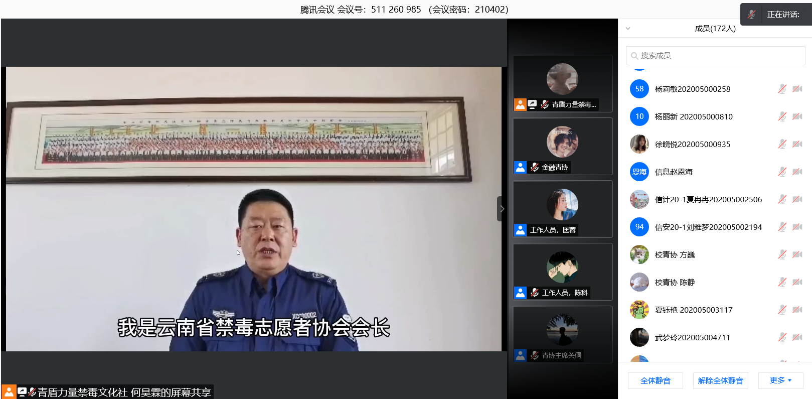 第二项议程,云南省禁毒志愿者协会会长束佳骏先生致辞。他向同学们讲述了毒品的危害性,禁毒的必要性及联合开展青盾力量禁毒防艾系列活动的重要性,并介绍了与金融学院合作开展过的一系列活动。紧接着,金融学院党委副书记汪薇萍老师宣布“青盾力量禁毒防艾”系列活动活动正式开幕。