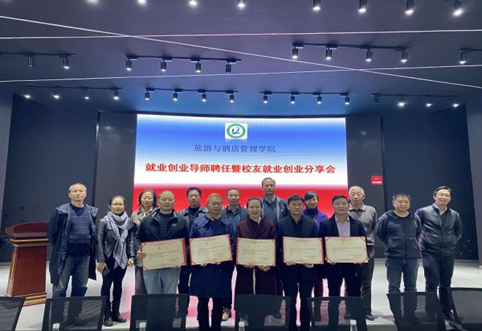 旅游与酒店管理学院院长晏雄为导师颁发聘书并合影留念。导师代表王庆兴致辞,他表示将履行好光荣职责,将自身对职业发展的思考和实践经验向学弟学妹们倾囊相授,教育引导好同学们并为同学们提供就业创业实践条件和资源。张向英代表学院致辞,他希望各位校友和导师能够利用自己丰富的实践经验和行业背景为同学们提供思想引领和指导,勉励同学们珍惜各位导师的宝贵智慧和真诚付出,不断从导师身上汲取人生智慧和成功经验,成就美好的人生。