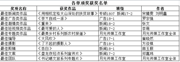 经角逐,《手艺》荣获金铎奖一等奖,《答案》《告白》荣获金铎奖二等奖,《爱是地狱冥犬》《相片》《D.O》荣获金铎奖三等奖,往届校友参展作品荣获“金声奖”,往届校友在校期间优秀作品获得传媒学院作品收藏证书。本次电视电影节还评选出最佳新闻类作品、最佳广告类作品等单项奖10项(见附表),经网络评选,作品《D.O》获最佳人气奖。