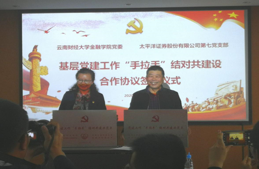 活动上,金融学院党委书记张建友和太平洋证券第七党支部书记欧阳婉青签署合作协议。