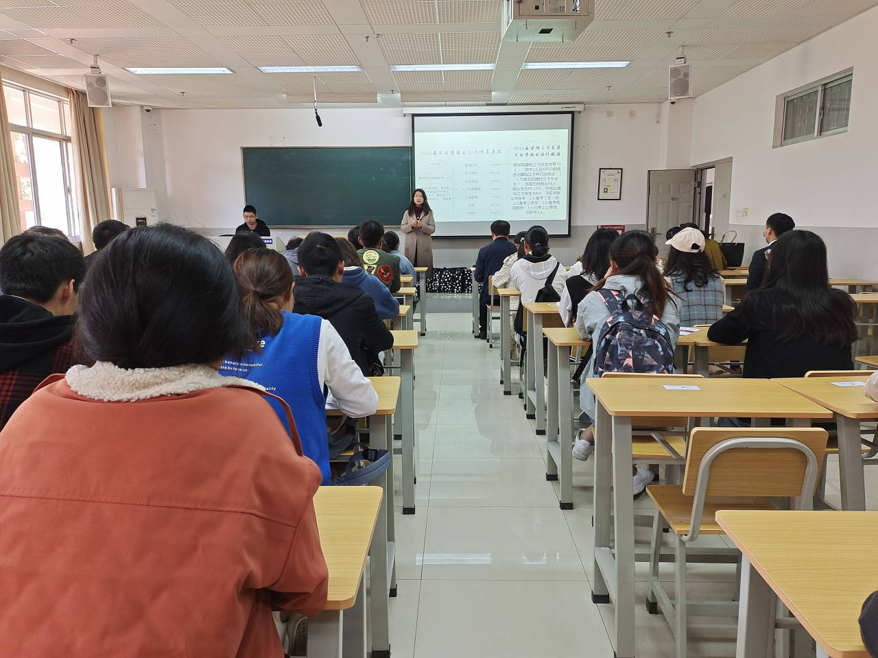 王敏介绍了商学院2020届毕业生就业工作情况和2020届建档立卡家庭毕业生就业统计数据,分析了受疫情影响下严峻的就业形势,希望2020级建档立卡新生做好大学四年规划,明确自身定位,确立奋斗目标,为之不懈努力,并鼓励2021届建档立卡毕业生把握好毕业季、就业季,积累面试应聘经验,兼顾实习任务的同时做好各种求职考试的准备。