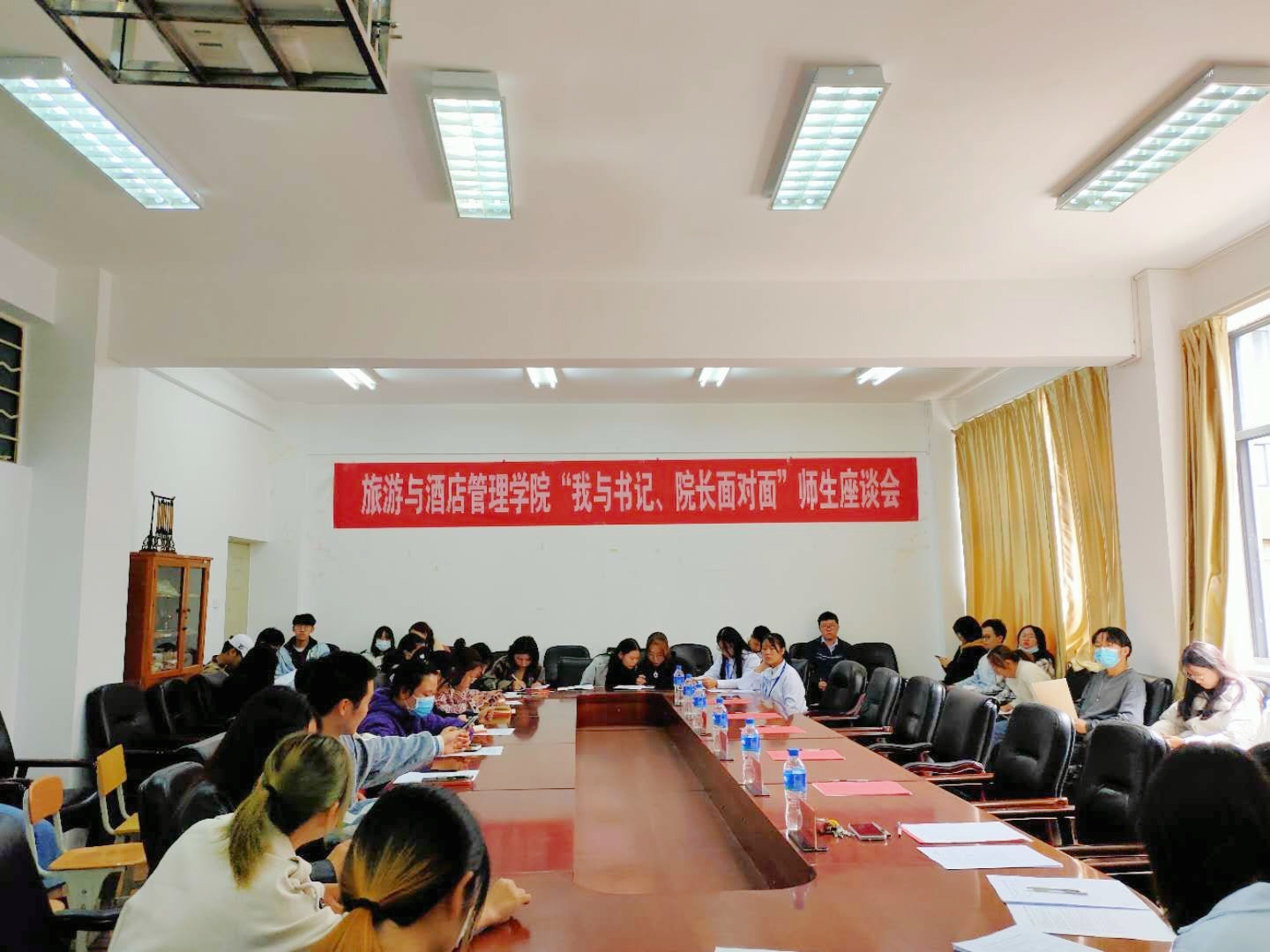为深入了解当前学生所关切的问题,针对学生在大学学习生活中遇到的各方面困惑做好排忧解难工作,更好地维护学生权益及成长成才,10月22日下午,旅游与酒店管理学院在卓远楼213会议室举行2020年“我与书记、院长面对面”师生座谈会。旅游与酒店管理学院院长晏雄、党委书记张向英、党委副书记王涛、副院长谢洪忠和王智慧,与党支部党员、入党积极分子、各团学组织学生骨干以及各年级班级学生代表进行交流,团委负责人代丽虹主持会议。