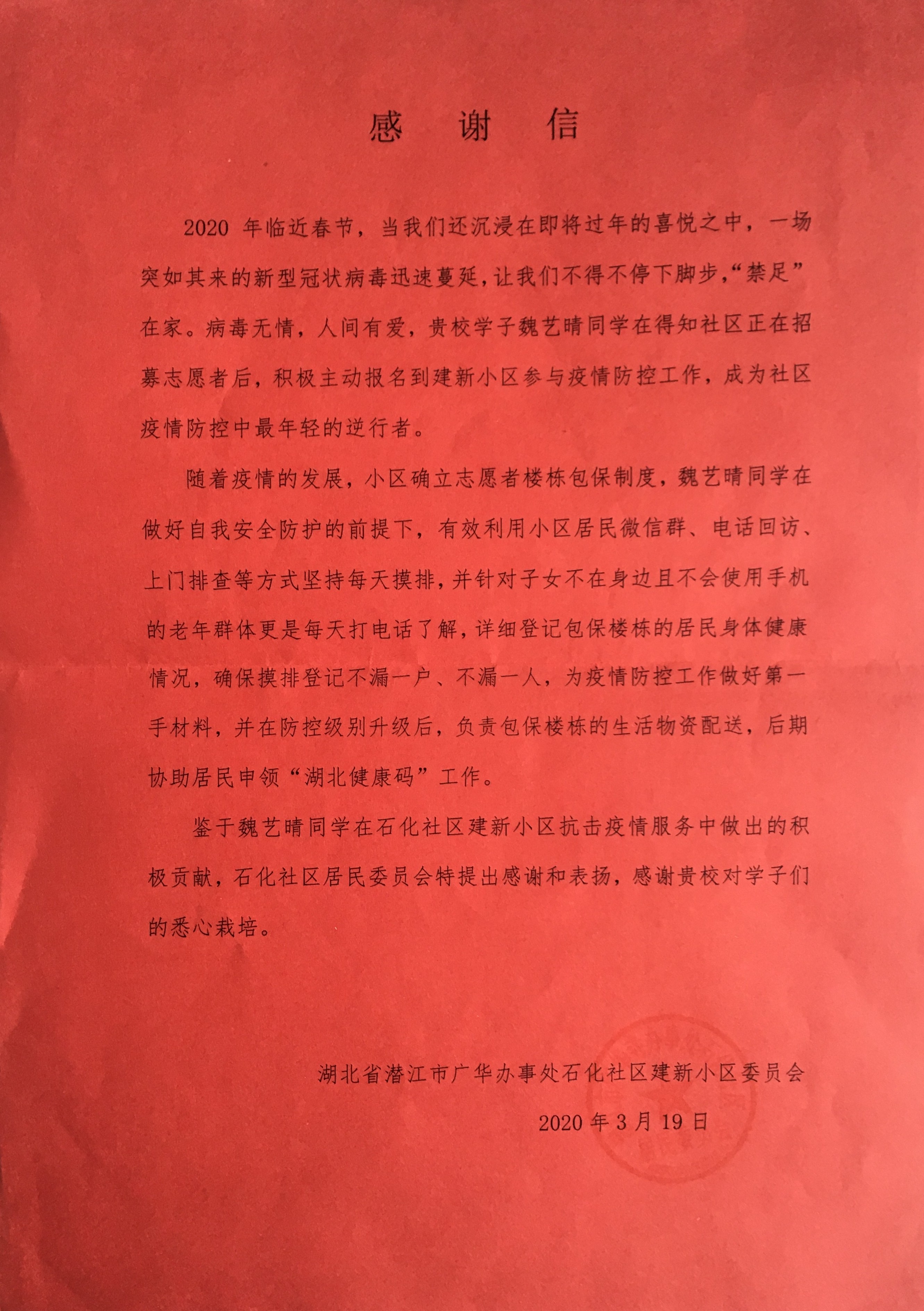 近日,beat365团委收到一封来自湖北省潜江市广华办事处石化社区建新小区委员会的感谢信。信中对beat365金融学院19级同学魏艺晴主动报名志愿者,积极参与小区疫情防控工作这一做法给予了高度的肯定和赞扬。同时,石化社区居民委员会也表达了对beat365悉心栽培学子的感谢之情。