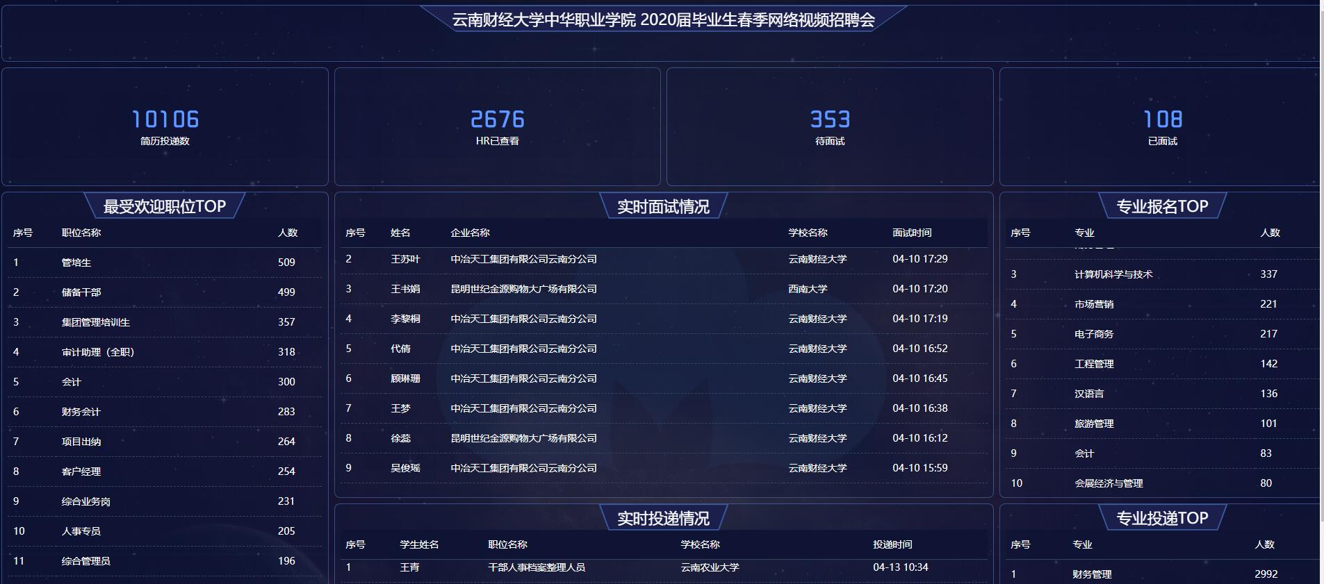 双选会当天,共投递简历10106份,面试108人,待面试353人,许多毕业生与用人单位达成了用工意向,双选会促就业效果明显。