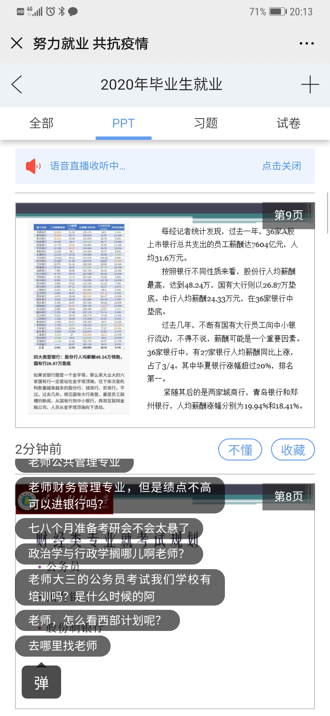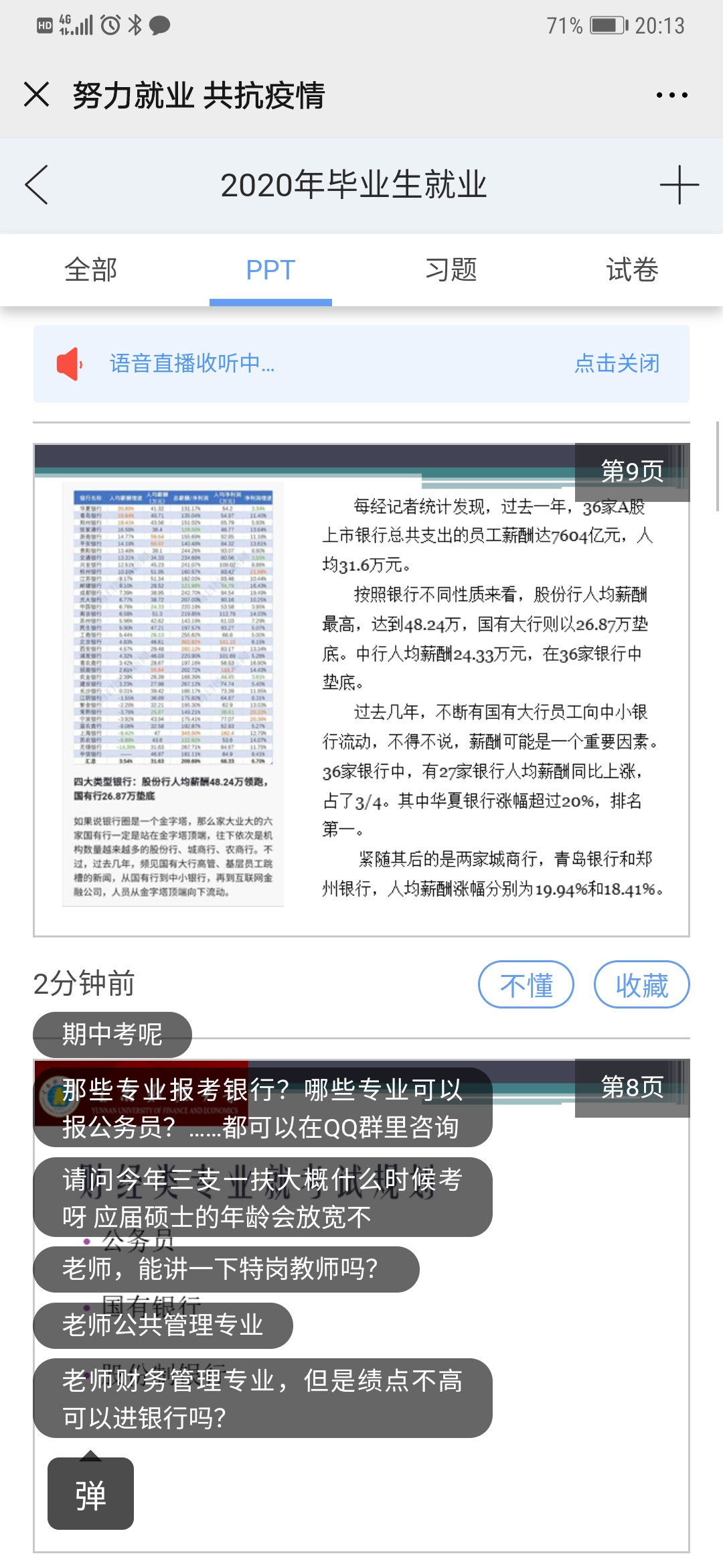 王彬重点分析了当前的就业形势,对毕业生关注的公职类考试信息以及如何备考做了详细讲解。课程中,同学们积极通过发表弹幕与老师交流,老师结合财经类和公共管理类专业特点进行了答疑。