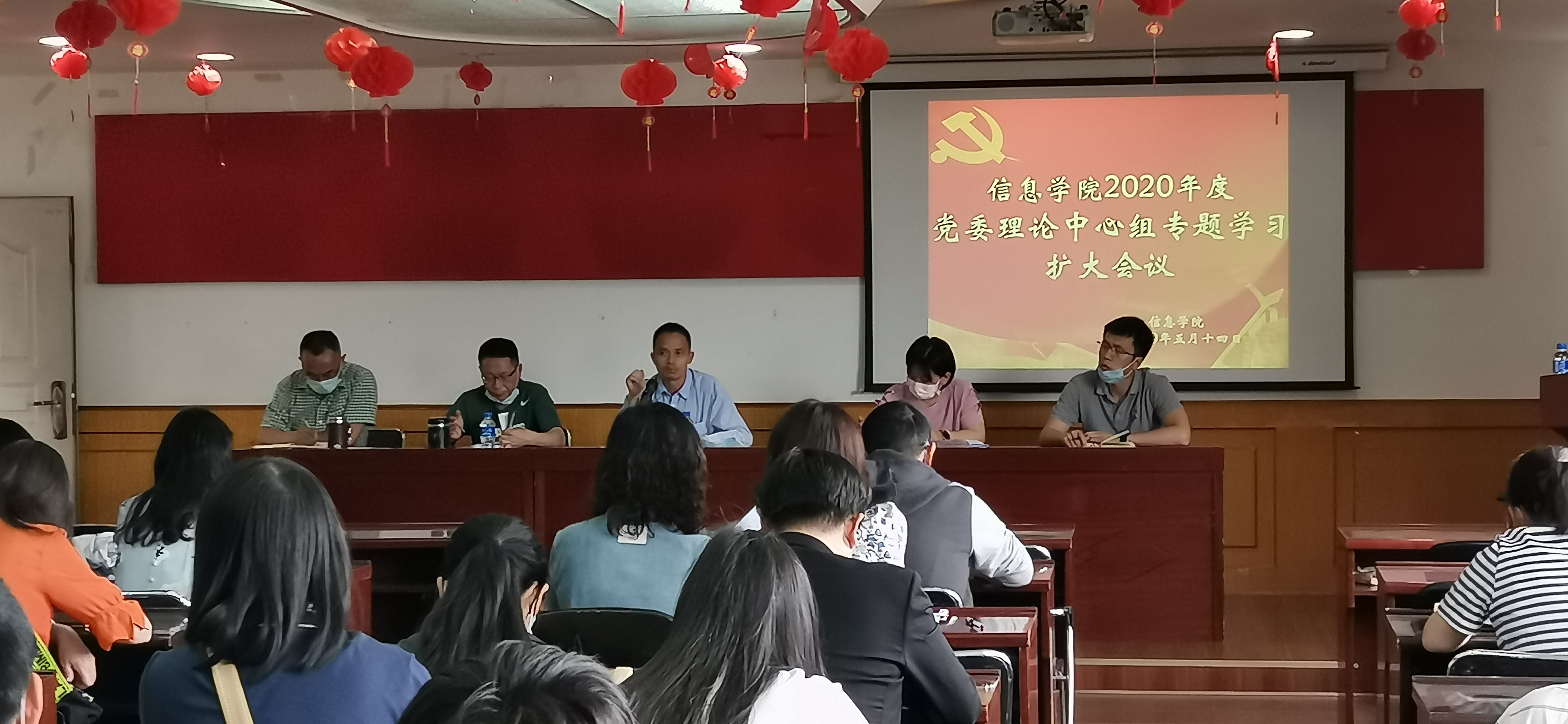 5月14日,信息学院召开2020年度教职工大会暨学院党委理论中心组专题学习扩大会议。学院全体教职工参加会议,会议由院党委书记何媛媛主持。