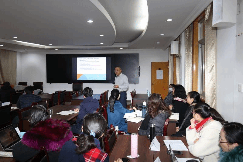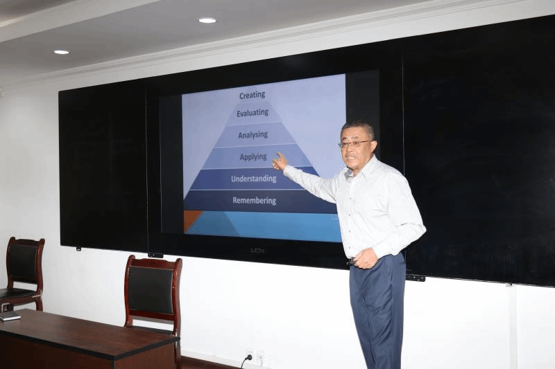 教学工作坊特邀加拿大UBC大学继续学院语言文化系原主任孙浪教授为主讲嘉宾,学院教授委员会主任颜宁教授负责管理与实施。工作坊从活动内容、时间安排到教室布置等多个环节均体现了以“学习者为主导”的教育教学理念。在为期四天2个场次的工作坊期间,孙浪分析了目前中国传统教育教学的现状和存在的问题;回顾了基于 6 个层次(Remembering 记忆、Understanding理解、Applying运用、Analyzing分析、Evaluating评价、Creating创造)的“以学习者为中心”教育原则;系统介绍了诸如 PBL(基于项目的学习模式)、FCM(翻转课堂)等北美先进的教学理念和教学实践方法;强调了从“Sage on the Stage”(讲台上的圣人)向“Facilitator/Director/Guide for the Learners”(学生学习的辅助者/指导者/引导者)的教师角色转变。孙浪鼓励参训教师积极参与讨论,分享教学过程中的经验与困惑,内容涵盖授课方式、课堂教学管理、小组活动设计、教学过程性评价等多方面。其间,两位参训教师分别展示了“国际商务前沿专题”和“国际商务”的课程设计方案。孙浪和参训教师有针对性地提出了改进意见和提升建议。