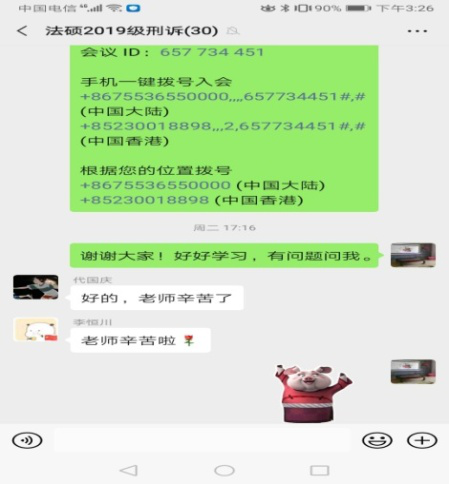 院长佴澎教授法律硕士课程《刑事诉讼法》,从教20年,因为新冠肺炎疫情,一切从新开始,从讲台上回到书房里,从投影前回到电脑前。“学院的教学指导简明扼要,指导团队实力雄厚,在她们的帮助下,我花了半天学习,自认为基本合格。下载腾讯会议,预定时间,通知同学们,我们开课了!虽然远隔万水千山,但我们越过大海重洋,在网络的课堂里,我们没有距离。”微信“课堂”里同学们的热情丝毫未减,讨论热火朝天。“老佴的网课怎么样啊?”“棒棒哒!”