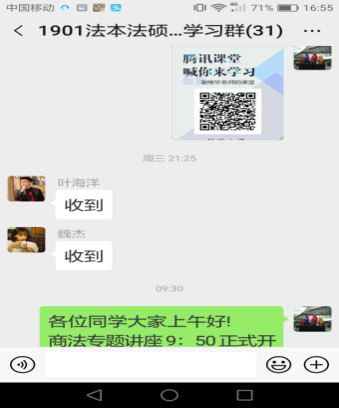 学院党委书记谢维华老师担任2019级法本法硕《商法专题讲座》课程,在上课之前学习了雨课堂的操作流程,在儿子的鼎力帮助下选用雨课堂、腾讯课堂、腾讯会议三个平台进行试教。在上课前建立了课程微信群,推送中国政法大学赵旭东教授讲授的商法学供同学学习,推送了第一讲的参考文献供同学阅读,并在微信群里征求同学对网课平台的接受程度,决定选用腾迅课堂直播教学,腾讯会议作备选。授课采用直播形式,开课前进行了一次签到,临近结束又签了一次,直播效果还不错,课后在微信群里跟同学进行了交流。