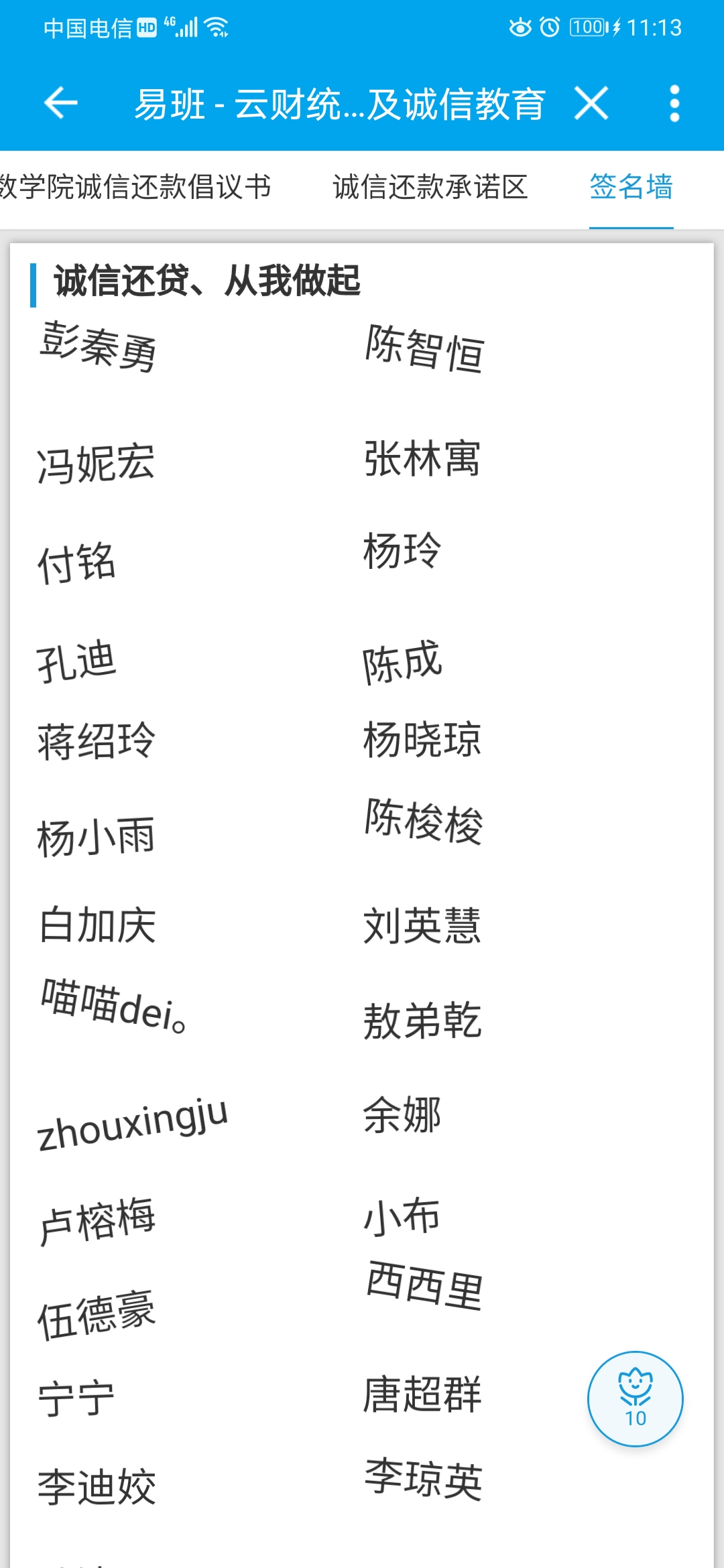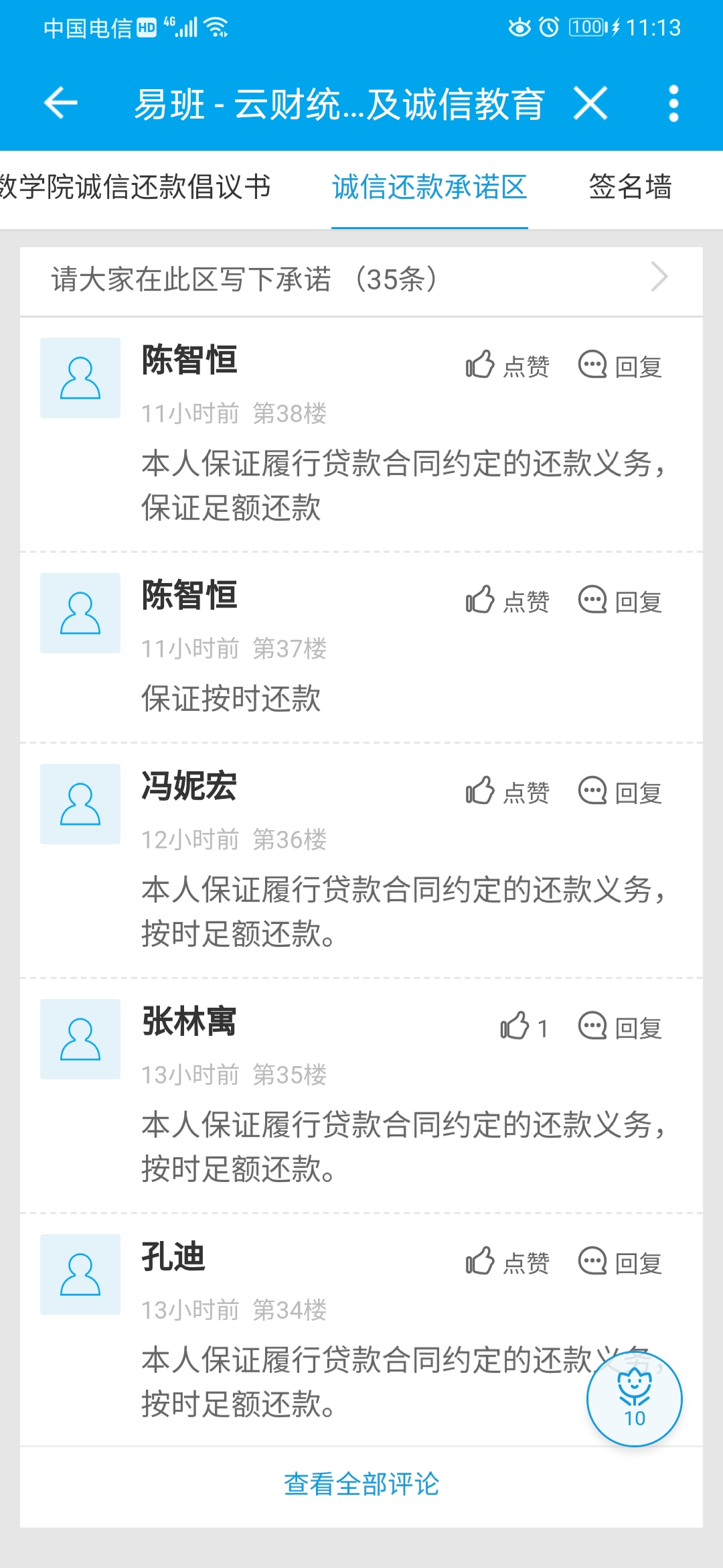 3月19日,学院在易班网搭建《云财统数生源地贷款还款指南及诚信教育》轻应用。通过发布学院毕业班生源地贷款安排、介绍生源地贷款相关政策及还款途径等板块,让学生在家中就能了解生源地贷款相关知识,知道还款途径;发布统数学院诚信还款倡议书,倡议学子恪守诚信、按时还款,珍惜自己的信用记录,为学弟学妹们做出表率,同时学会感恩,应用所学知识回报国家和社会的帮助,积极塑造新时期大学生的良好形象;搭建诚信还款承诺区,鼓励并督促学生按时足额还款。
