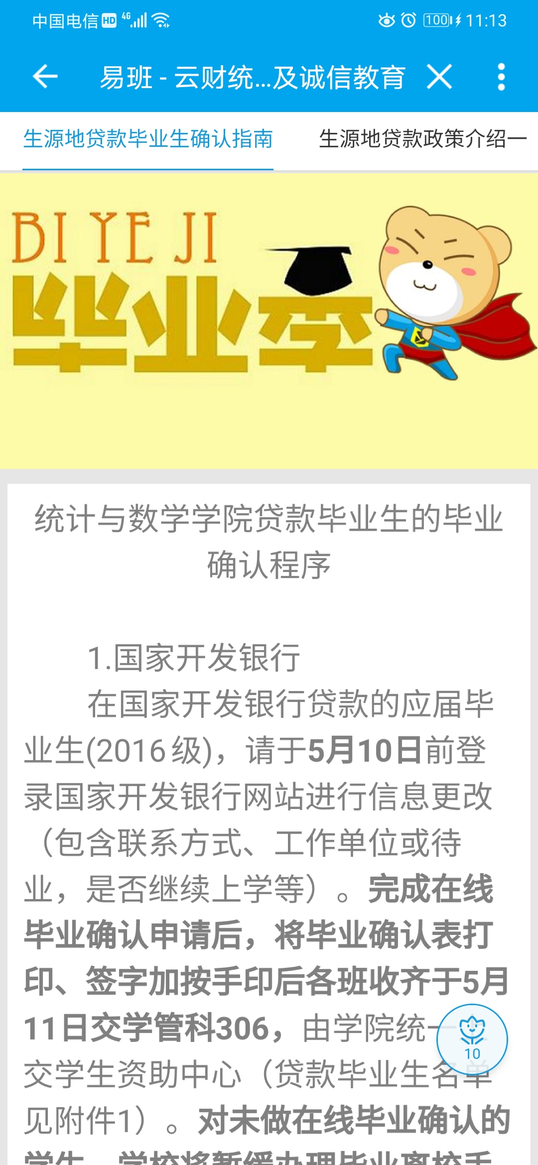 为加强生源地助学贷款政策教育,增强贷款毕业生的诚信还贷意识,3月份以来,统计与数学学院根据目前受疫情影响暂未开学的实际情况,充分利用易班网等互联网平台,积极探索生源地贷款诚信教育新模式。