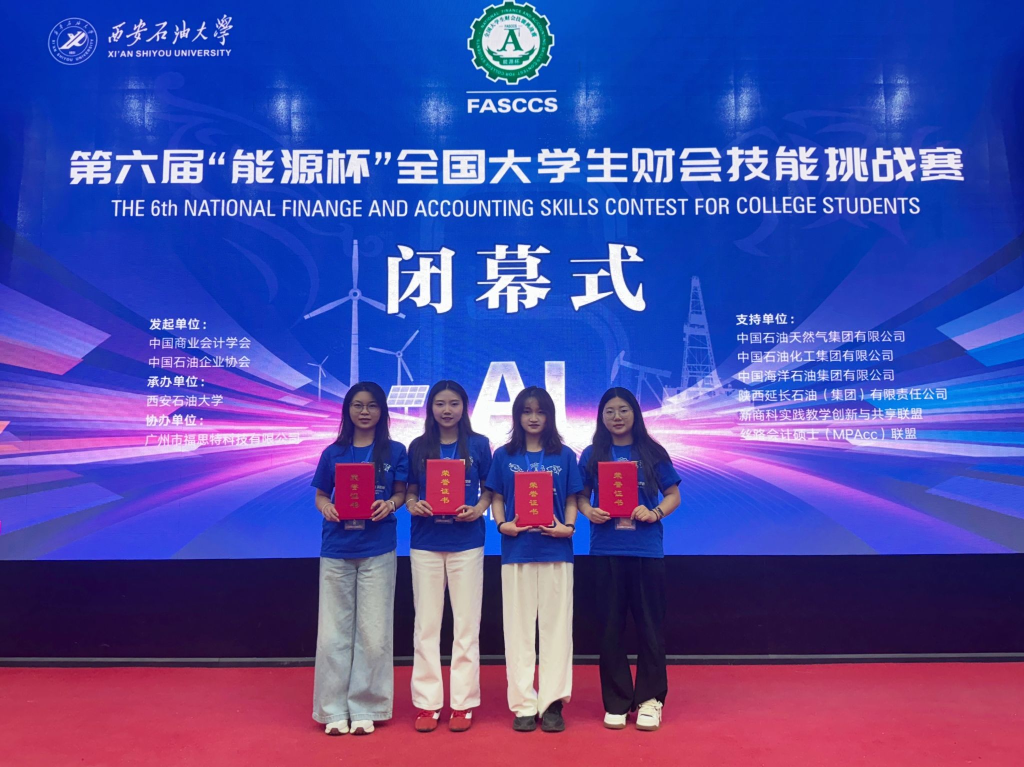 5月17日,第六届“能源杯”全国大学生财会技能挑战赛决赛在西安石油大学举行。经过定人必答、定队必答、抢答、共答和闯关冲刺等环节,beat365会计(审计)学院杨顺吉、钱欣月、李严秀、周洁四名同学组成的参赛团队荣获全国一等奖,beat365英国官方网站荣获优秀组织奖。