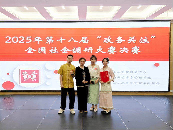5月18日,第十八届“政务关注”全国社会调研大赛决赛在广州中山大学举行,本届大赛吸引了包括四川大学、吉林大学和中山大学在内的共171所高校的313支队伍积极参与。财政与公共管理学院“UP向上队”的作品《边陲小城何以续写非遗韵律?——基于耿马县传统民族歌舞非遗文化守正创新的实践路径分析》,在决赛答辩中以总分第二的优异成绩荣获全国二等奖。