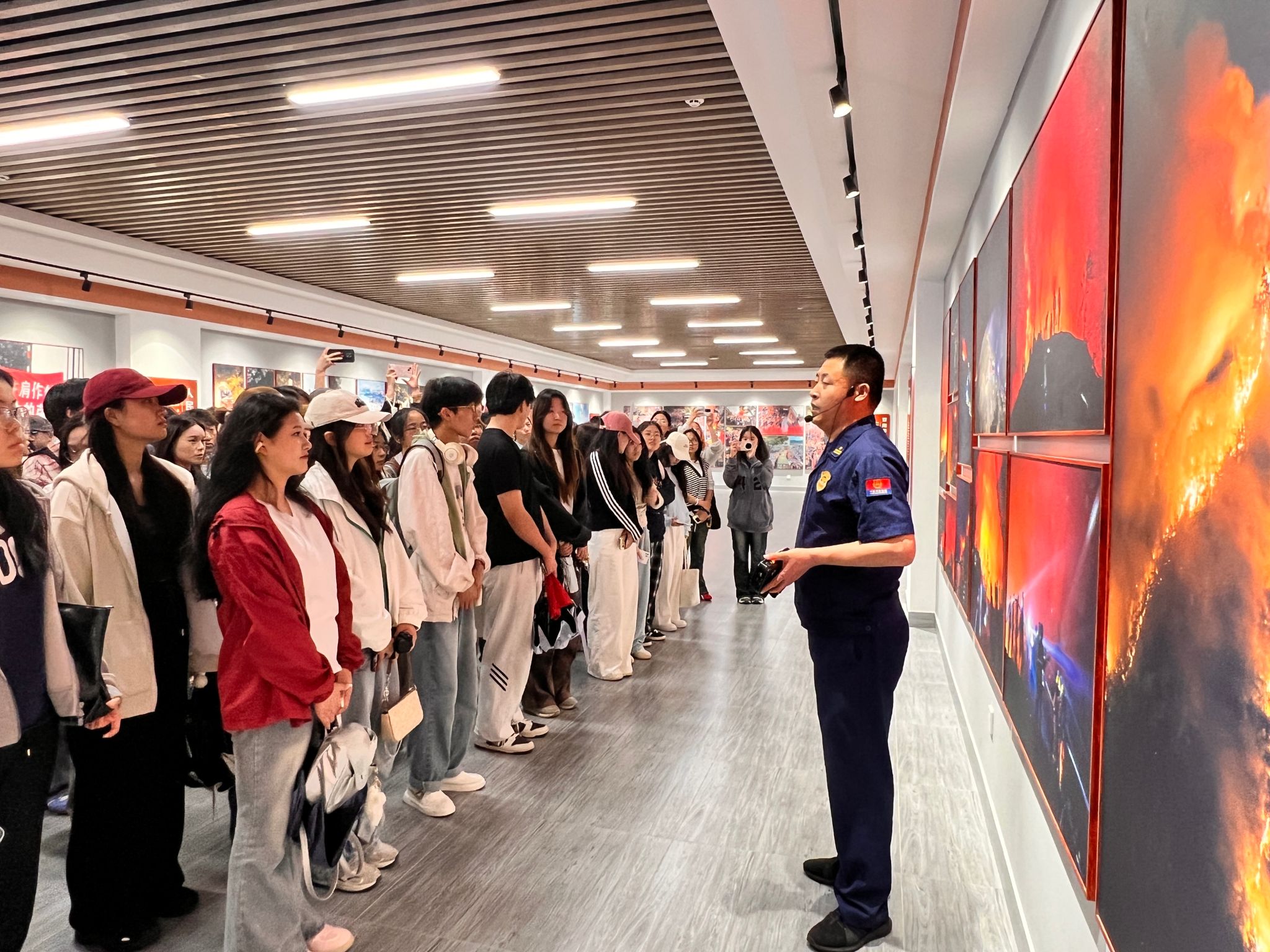在“山城逆行者——云南森林消防增援重庆灭火纪实展”前,讲解员薄正喜向师生们现场讲述:“36小时内,600名指战员肩扛手推,在悬崖上开辟出10公里长的防火屏障,这背后是后方19个物资保障组、2000余名志愿者的全力支援。”这场英雄壮举体现了指战员们的智慧与汗水,更是中国特色社会主义制度优越性和“人民至上、生命至上”发展理念的生动展现,深刻诠释了“一方有难、八方支援”的团结奉献精神。