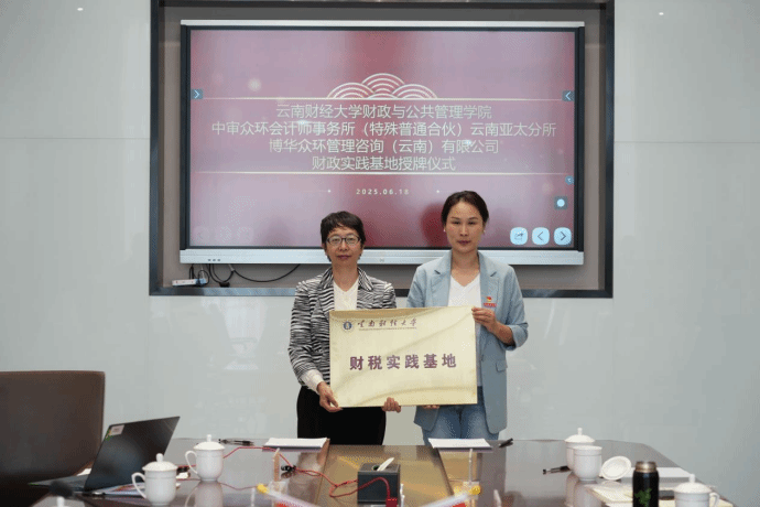 6月18日上午,财政与公共管理学院党委书记王晓芬带队赴中审众环会计师事务所(特殊普通合伙)云南亚太分所、博华众环管理咨询(云南)有限公司开展访企拓岗调研,举行财税实践基地签约挂牌仪式,并与中审众环会计师事务所(特殊普通合伙)云南亚太分所联合党总支部共同开展党建共建活动。活动由亚太经济服务(云南)集团有限公司董事、博华众环管理咨询(云南)有限公司总经理肖勇主持。