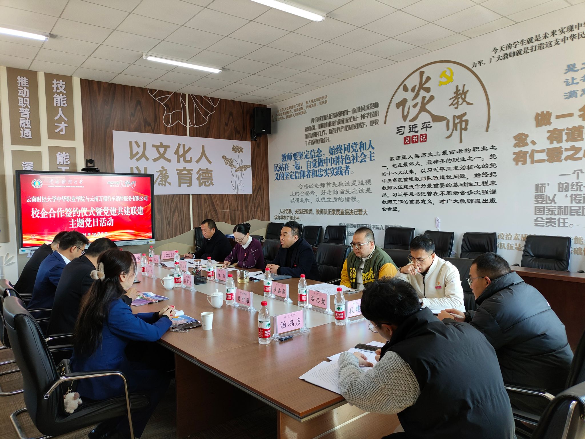 为深化校企合作,推进党建与业务深度融合,12月5日下午,中华职业学院与云南万福汽车销售服务有限公司(以下简称“云南万福”)在beat365英国官方网站安宁校区修远楼512会议室举行校企合作签约仪式暨党建联建共建主题党日活动。学院党委书记保伟与云南万福汽车销售服务有限公司总经理彭有良签订校企合作协议并授牌。活动由学院党委副书记兼纪委书记张玉琨主持。