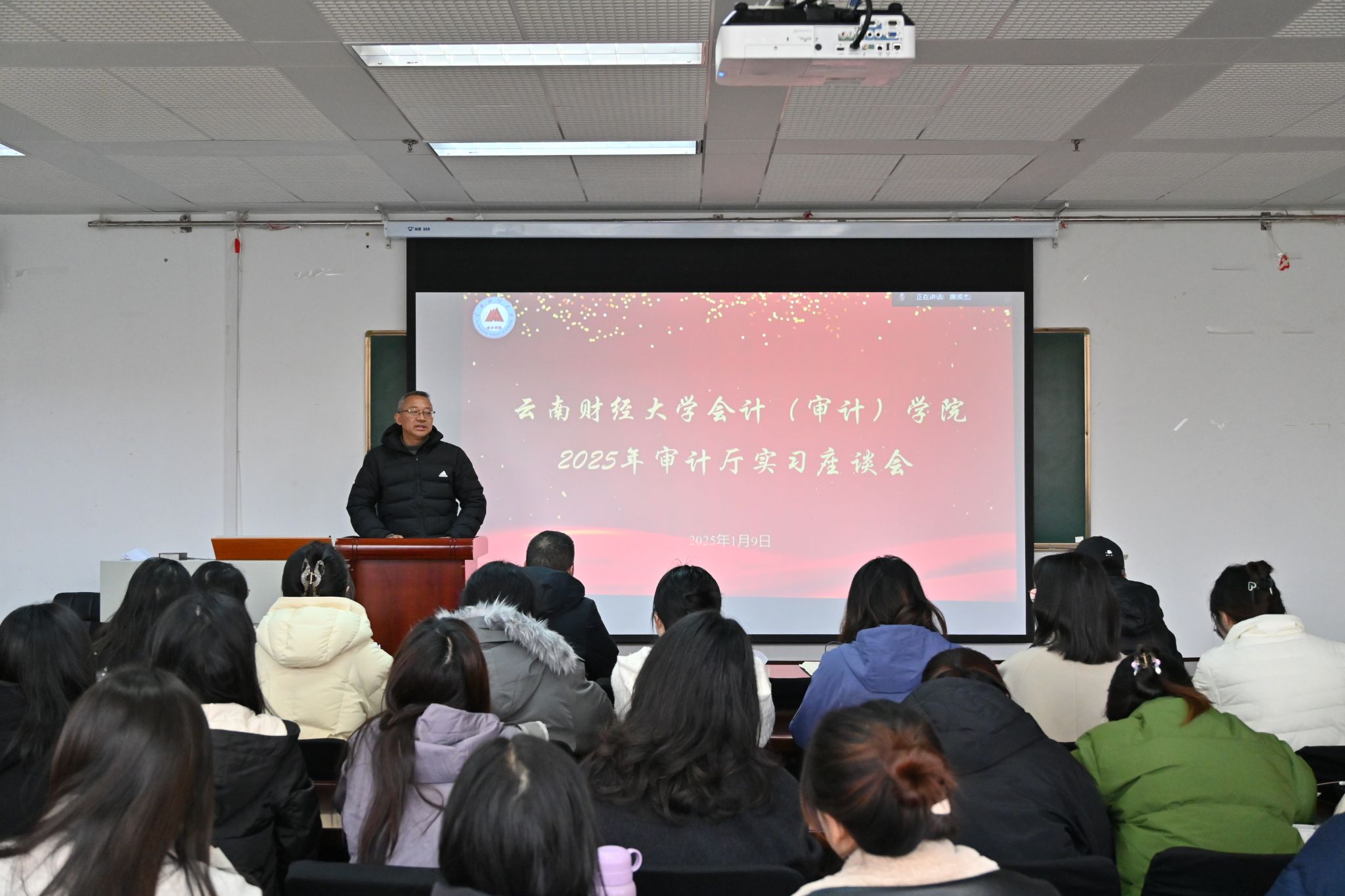 1月9日,会计(审计)学院在逸夫楼804召开2025年度云南省审计厅实习座谈会。学院院长李小军、党委书记李丽忠、辅导员路磊鸿以及拟选派至云南省审计厅实习的全体研究生参加会议。座谈会由专硕中心副主任黄明明主持。