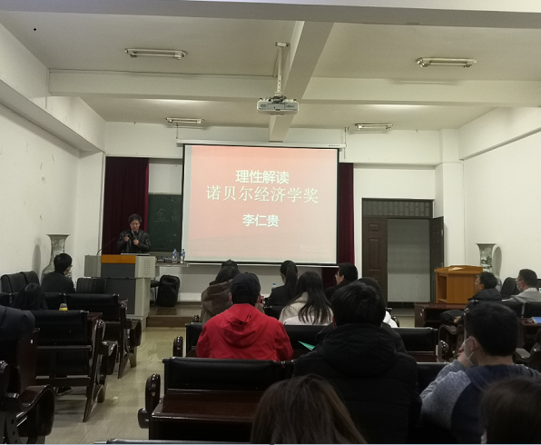 12月27日,由金融学院和科学技术处共同主办的“金融系列学术报告”在博远楼103会议室举行。本次报告主讲嘉宾为中国社科院《经济学动态》编辑部副主任李仁贵研究员,报告题目为“理性解读诺贝尔经济学奖”。学院熊德平院长、魏宇教授、周伟副院长、李江城副院长,以及部分青年教师、博士和硕士研究生参加了本次报告,报告由熊德平主持。
