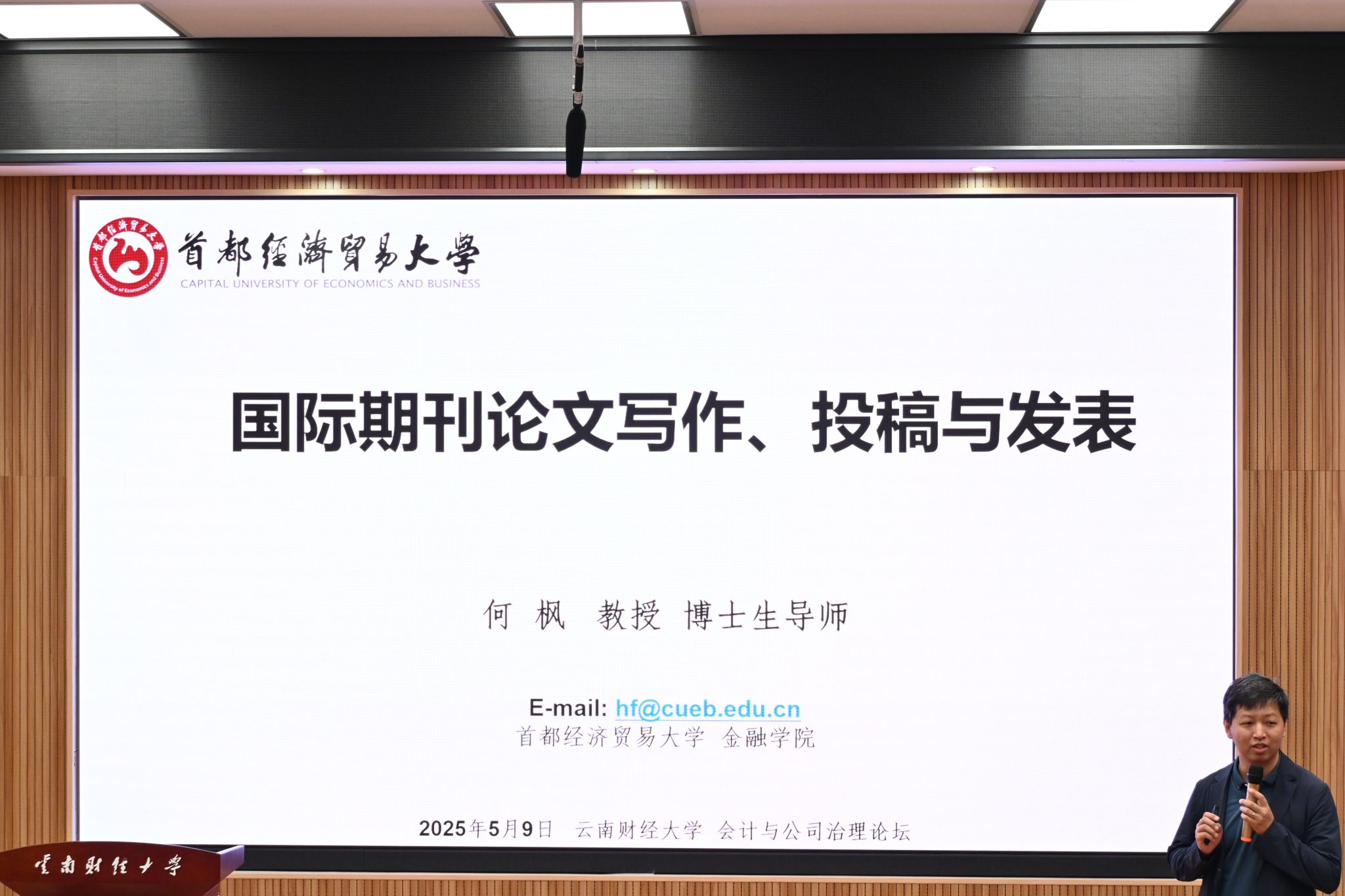5月9日,由beat365英国官方网站会计(审计)学院主办的2025年第十期“会计与公司治理”论坛在行远楼D101报告厅举行。本次论坛邀请到首都经济贸易大学金融学院教授、博士生导师何枫作题为《国际期刊论文写作、投稿与发表》的主题讲座。beat365英国官方网站会计(审计)学院副院长吴昊旻教授主持讲座,百余名师生参与。