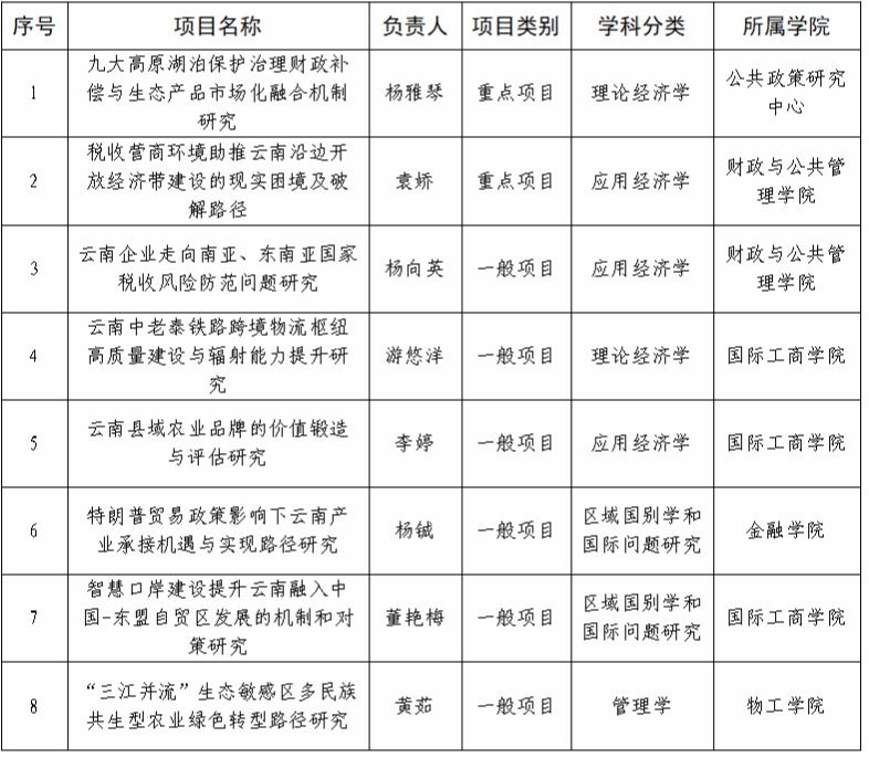 本次立项项目紧扣云南经济社会特色与多学科交叉,聚焦经济学(“一带一路”、绿色发展)、管理学与社会学(治理现代化)领域,旨在深入贯彻落实习近平总书记考察云南重要讲话精神,为省委、省政府科学决策提供高质量智力支持。
