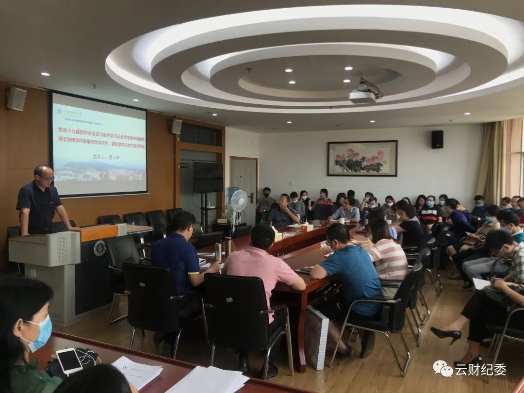 6月4日下午,财政与公共管理学院在逸夫楼923会议室开展党委理论学习中心组第三次集中学习暨全院教职工理论学习活动。理论学习围绕《贯彻十九届四中全会及习近平总书记云南考察讲话精神,落实学院学科发展与学术研究,服务学校与地方经济社会发展》为主题展开。副院长缪小林领学,理论学习由院党委书记朱文主持。