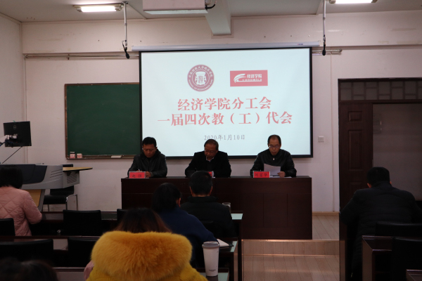 经学校工会批准,1月10日下午15:00,经济学院分工会在博远楼203会议室召开一届四次教(工)代会,学院全体教职工参加会议,会议由学院党委副书记、纪委书记赵强主持。