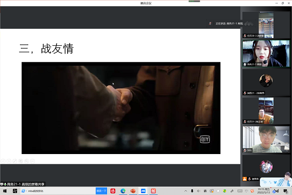 活动开始,同学们观看了优秀红色影片的剪辑,一个个有血有肉的伟大先辈形象、一个个慷慨激昂的英雄故事,无不使同学们动容。观看结束后同学们进行了精彩的思想交流,分享了红色影片与他们之间的故事,气氛十分活跃。其中,商务21-1班的高琪同学为我们分享了观看优秀影片《长津湖》后的感受。她说:“我们现在的美好生活就是这部电影的后续”。听完该同学的分享后大家纷纷表示赞同。大家都认为我们现在的生活来之不易,没有先辈们的奋斗,何来我们现在的幸福生活。所以我们青年学生也要继续奋斗。