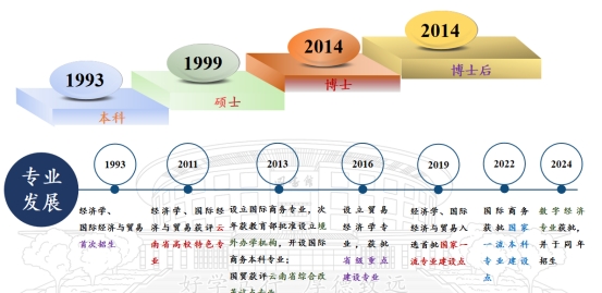 beat365英国官方网站经济学院由1993年成立的云南财贸学院经济系发展而来,历经两次院系调整,深耕经济学教育与研究三十余载。在数代“云财经济人”的接续奋斗下,学院已形成学科体系完善、师资力量雄厚、人才培养扎实的办学格局,综合实力稳居云南省经济学领域前列。