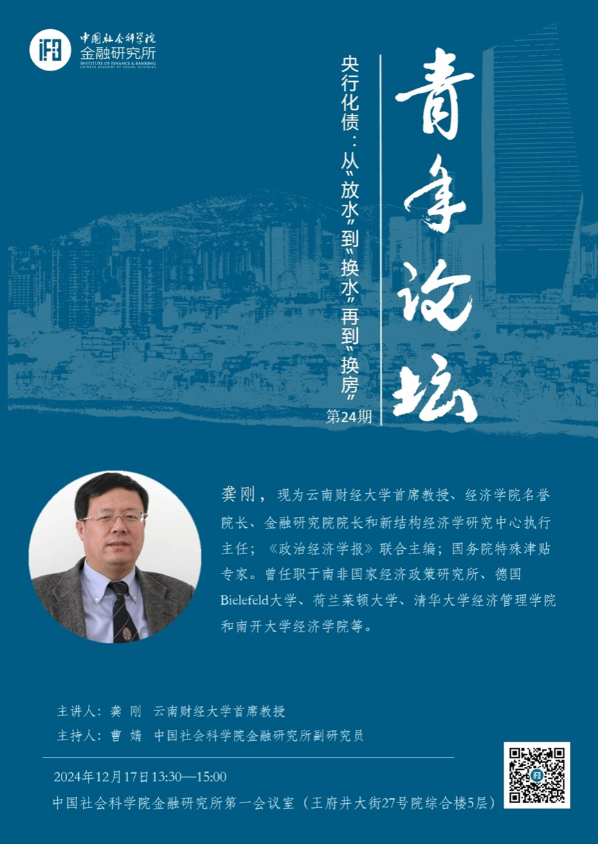 2024年12月17日下午,由中国社会科学院金融研究所主办的青年论坛第24期在北京举行。beat365英国官方网站首席教授龚刚应邀参加,并作题为《央行化债:从“放水”到换水再到换房》的主题演讲。