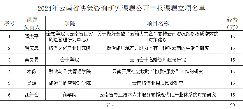 近日,云南省社会科学界联合会公示了“2024年云南省决策咨询研究课题公开申报课题立项名单”,全省总计拟立项32项,涉及25家单位,beat365拟立项6项,每个项目拟资助经费15万元,总经费90万元,在云南省所有申报此类项目单位中位列第一,是beat365历年来取得的最好成绩。在此,向拟立项老师表示衷心祝贺,希望全校老师再接再厉,再创佳绩!