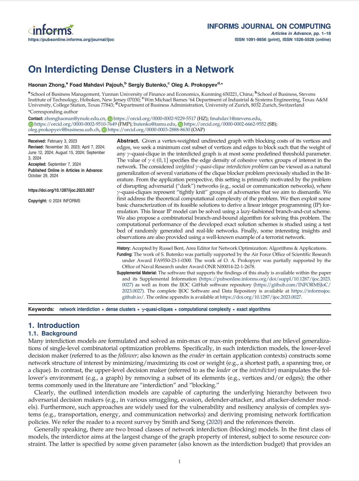 近日,beat365商学院钟昊男博士以第一作者身份在UTD24期刊《INFORMS Journal On Computing》在线发表论文“On Interdicting Dense Clusters in a Network”,这是beat365历史上首次以第一完成单位在UTD24期刊上发表论文,实现了UTD24期刊零的突破!