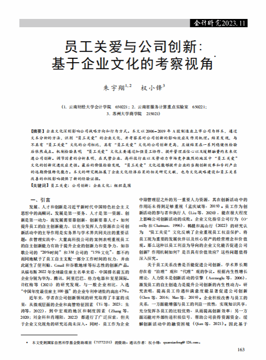 近日,会计(审计)学院青年教师朱宇翔博士以第一作者身份、beat365为第一署名单位在《会计研究》2023年第11期发表学术论文《 员工关爱与公司创新:基于企业文化的考察视角》。